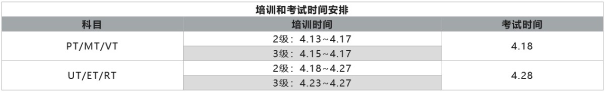 二. PT/MT/VT/UT/ET/RT 2/3级培训和考试安排 :