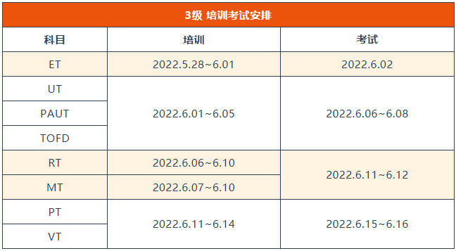 6月主要开展渗透检测(PT)、磁粉检测(MT)、超声检测(UT)、射线检测(RT)、涡流检测(ET)、目视检测(VT)、相控阵超声波检测(PAUT)和衍射时差法(TOFD),共8种方法的2级和3级的培训和考试鉴定工作。