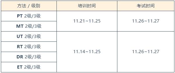 10月主要开展目视检测(VT)、渗透检测(PT)、磁粉检测(MT)、超声检测(UT)、射线检测(RT)、数字射线检测(DR)、涡流检测(ET) ,共6种方法的2级和3级的培训和考试鉴定工作。