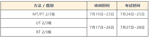2023年7月将在珠海要开展渗透检测(PT)、磁粉检测(MT)、超声检测(UT)、射线检测(RT) ,共3种方法的2级和3级的培训和考试鉴定工作。